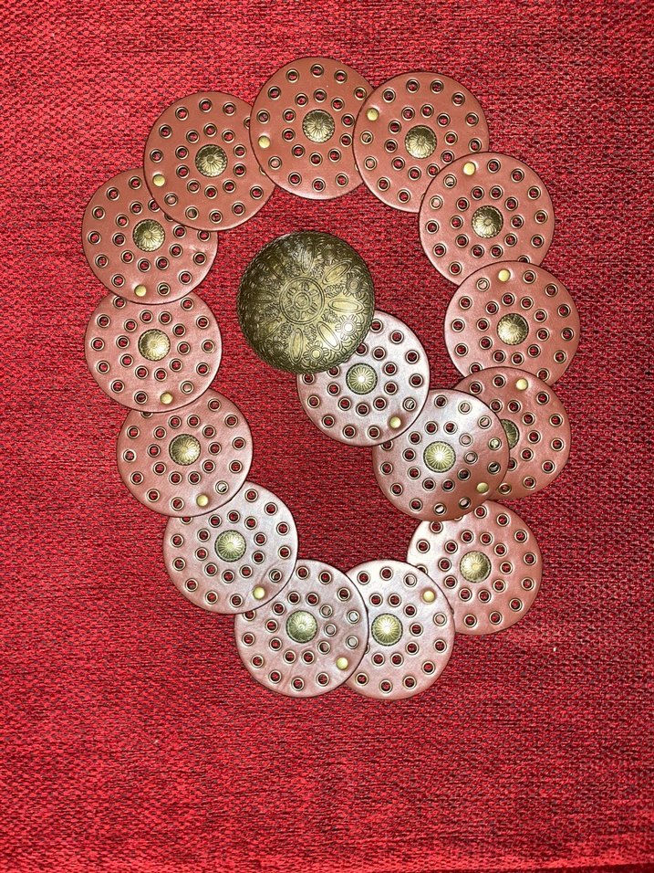 Parlak boncuklu tekstil disklerden oluşan kırmızı bohem kadın kemeri, vintage tarzı metal tokaya sahiptir.