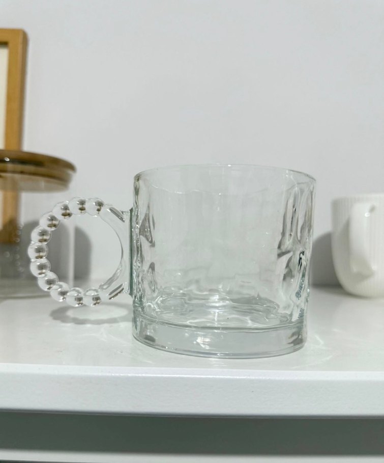 Boncuklu kulpu ile dikkat çeken şeffaf cam kupa, içecekleriniz için şık bir seçenek sunar. ☕
