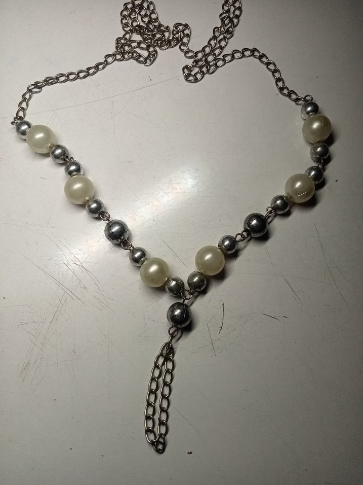 Gri zincir detaylı, inci görünümlü boncuklu uzun beyaz kolye. Küpe ise büyük taşlı gül motifli güzel,şık takıdır (ikisi bir satılır) *biraz eski ve uzun süredir hiç kullanılmamış takılar küpede sorun yok ama kolyede zincir bağlama kısmında minik yeşiller vardır*