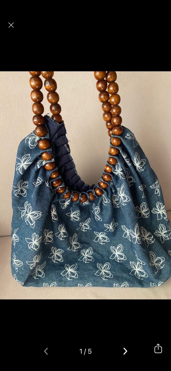 Lacivert denim kumaştan, beyaz batik çiçek desenli ve boncuklu ahşap saplı bohem tarz kadın çantası.