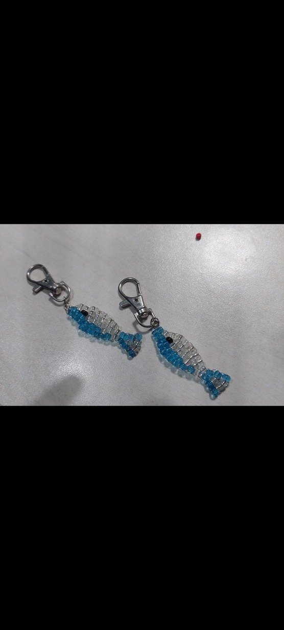 Renkli boncuklardan yapılmış mavi ve şeffaf balık figürlü anahtarlık, metal toka ile tamamlanmıştır. Bohem ve minimalist tarzlara uygundur. El yapımıdır. Adet fiyatıdır.