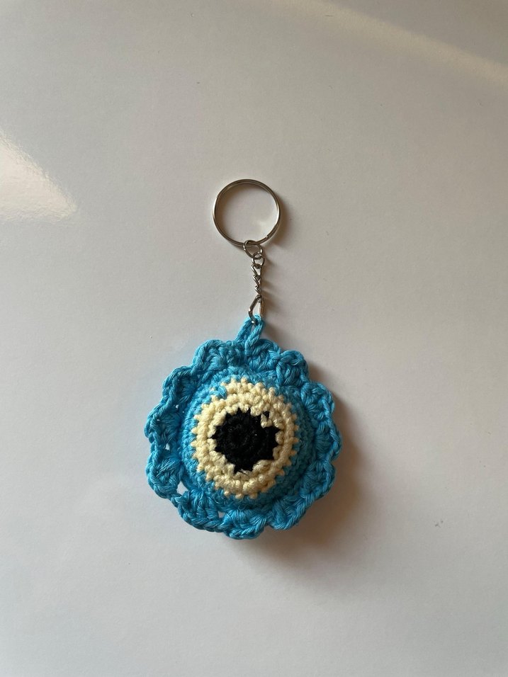 Canlı mavi renkli, boncuklu tasarıma sahip, bohem ve rahat bir stile uygun anahtarlık.