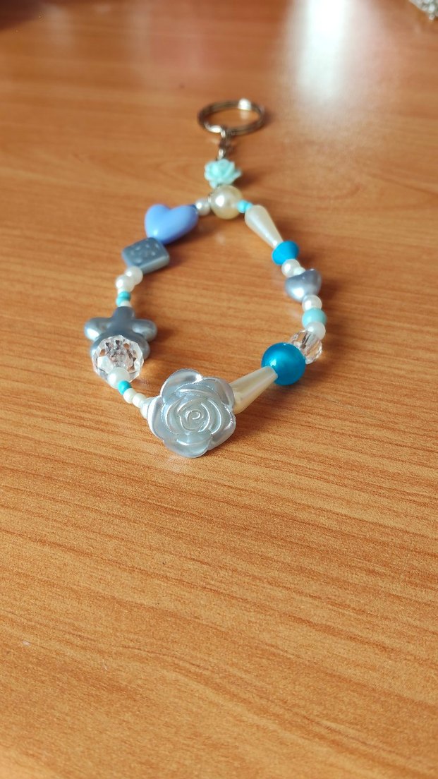 Çiçek ve kalp şekilli boncuklardan oluşan, pastel turkuaz tonlarında bohem tarzı anahtarlık.
