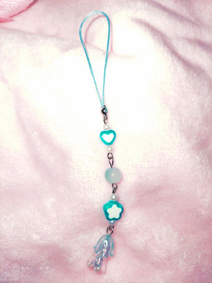 Boncuklu, kalp, çiçek ve el figürlü turkuaz renkte bohem tarz kadın charm. Minimalist tasarım ve batik desenle günlük kullanıma uygun. Telefon ve anahtarlık olarak kullanılır.