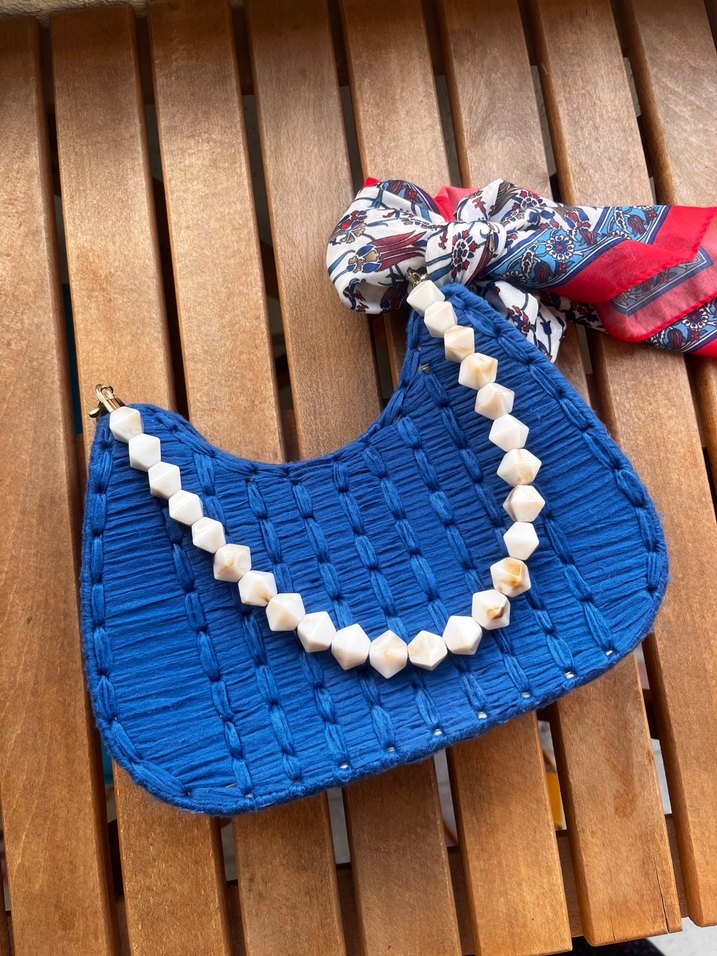 Mavi renkli, boncuklu saplı ve renkli batik fular detaylı bohem tarzda örgü kadın çantası, günlük kullanıma uygundur.