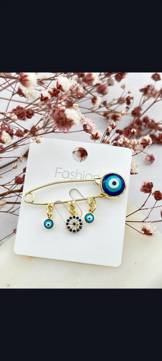 Bohem tarzda, altın renkli iğnede mavi boncuklu nazar boncukları bulunan, nakış detaylı renkli broş. Günlük kullanıma uygundur.
