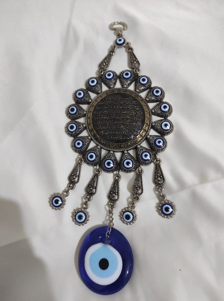 Bohem tarzda, boncuklu ve nakışlı koyu mavi kadın charm, ev ve rahat ortamlar için nazar boncuklu koruyucu motiflere sahiptir.