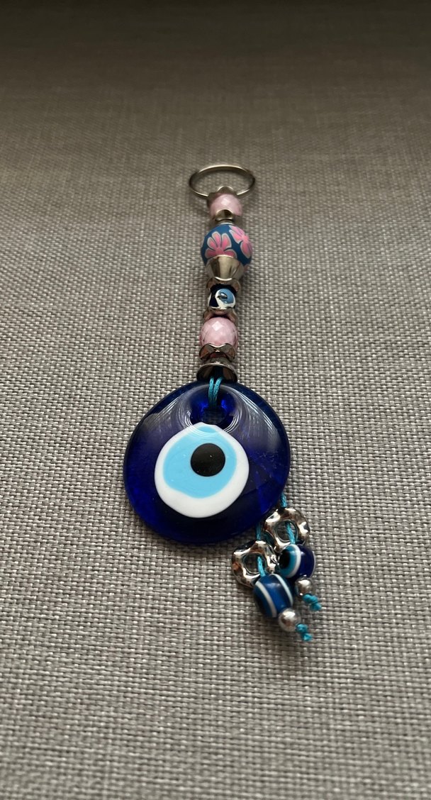 Mavi nazar boncuğu ve renkli boncuklarla süslenmiş bohem tarzda boncuklu duvar süsü Anahtarlık olarak da kullanılabilir.19 cm.