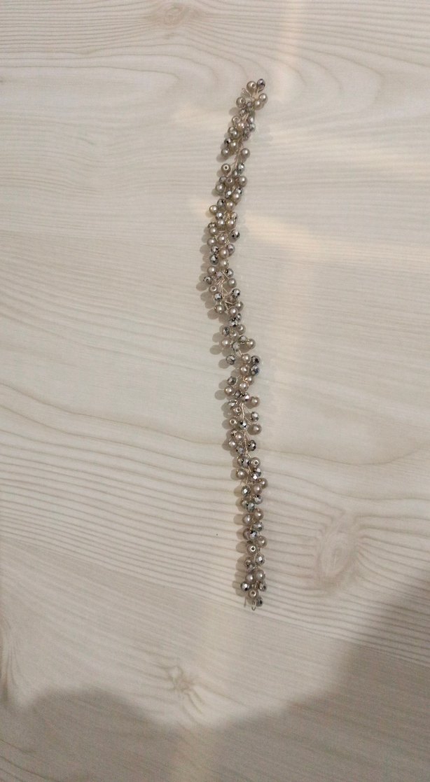Bu kadın saç aksesuarı, bej metal üzerine yerleştirilmiş gri boncuklarla minimalist ve çağdaş tarzı birleştirir. ✨