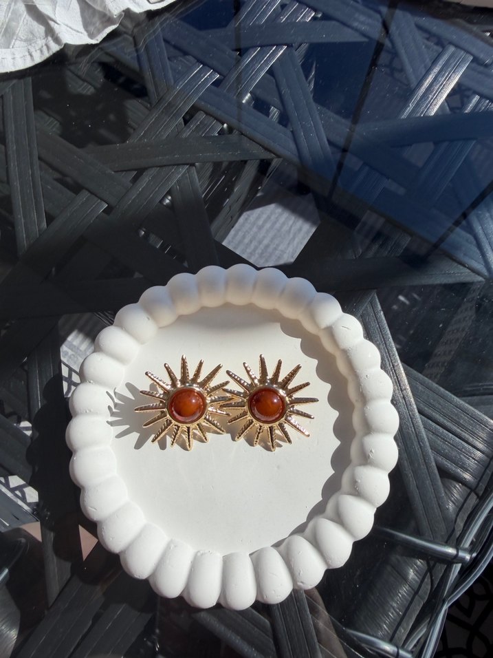 Parlak kahverengi boncuklu, güneş figürlü kısa uzunlukta bohem tarzda küpelerdir. Minimalist ve günlük kullanıma uygundur. ☀️