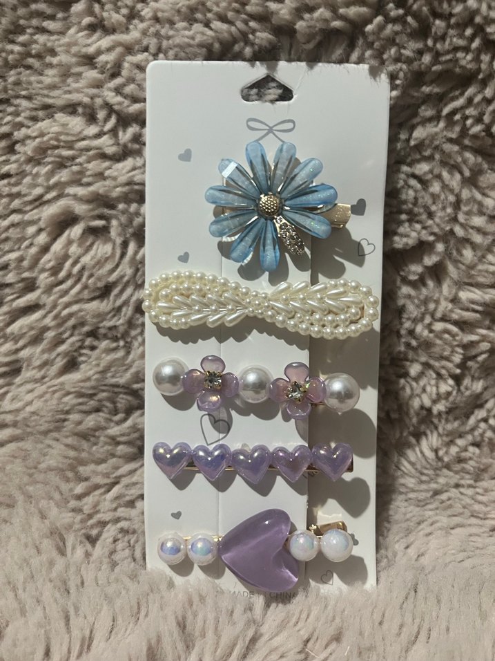 Pastel mor renkli, boncuklu ve çiçekli detaylara sahip bohem tarzda saç tokası seti. Plastik malzemeden üretilmiştir.