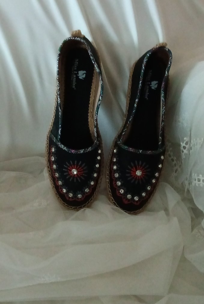 Koyu renkli, çok renkli, nakışlı ve boncuklu detaylara sahip kadın espadrilleri. El yapımı kauçuk tabanlı, günlük kullanım için uygundur.