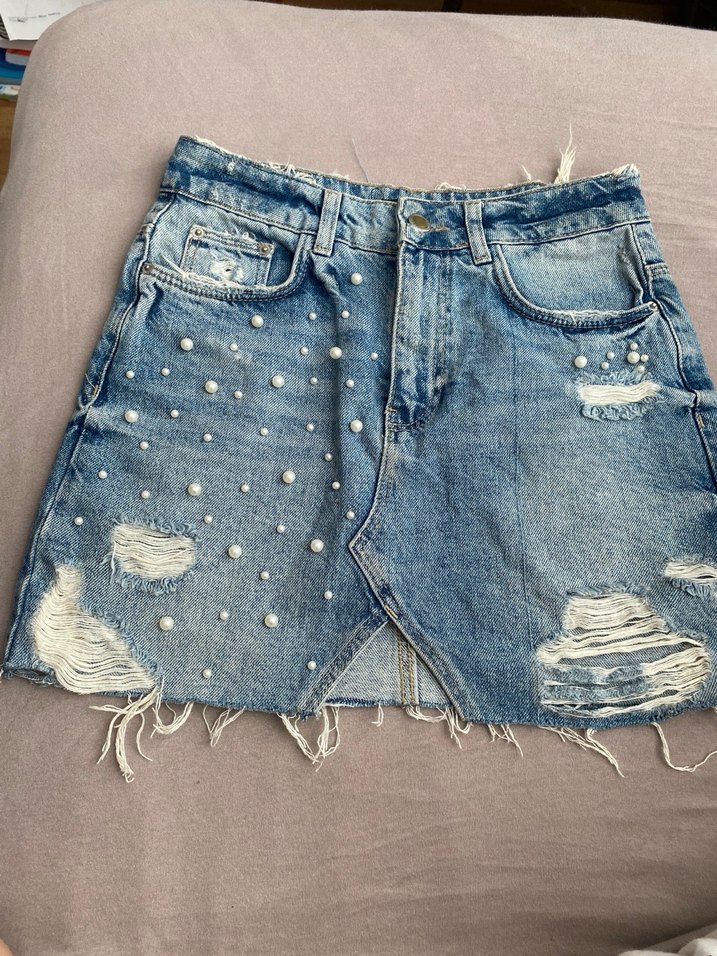 Boncuk işlemeli, yırtık detaylı, bol kesim mavi kot mini etek, rahat sokak stili için uygun. İp çekilmesi var çok rahatsız edici boyutta değil