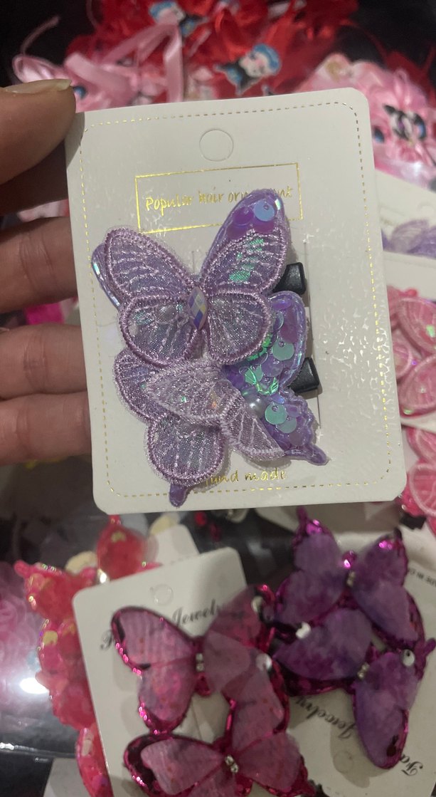 Mor renkte, nakışlı ve boncuk detaylı kelebek figürlü çocuk saç tokası, bohem tarzı için uygundur.