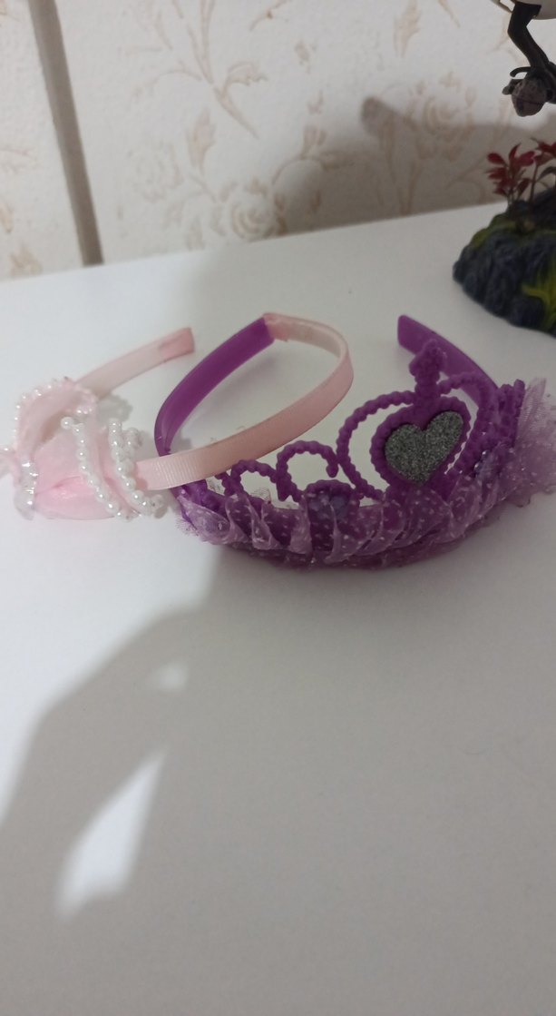 Mor kalp işlemeli ve tüllü ile pembe boncuklu iki renkli çocuk taçları.