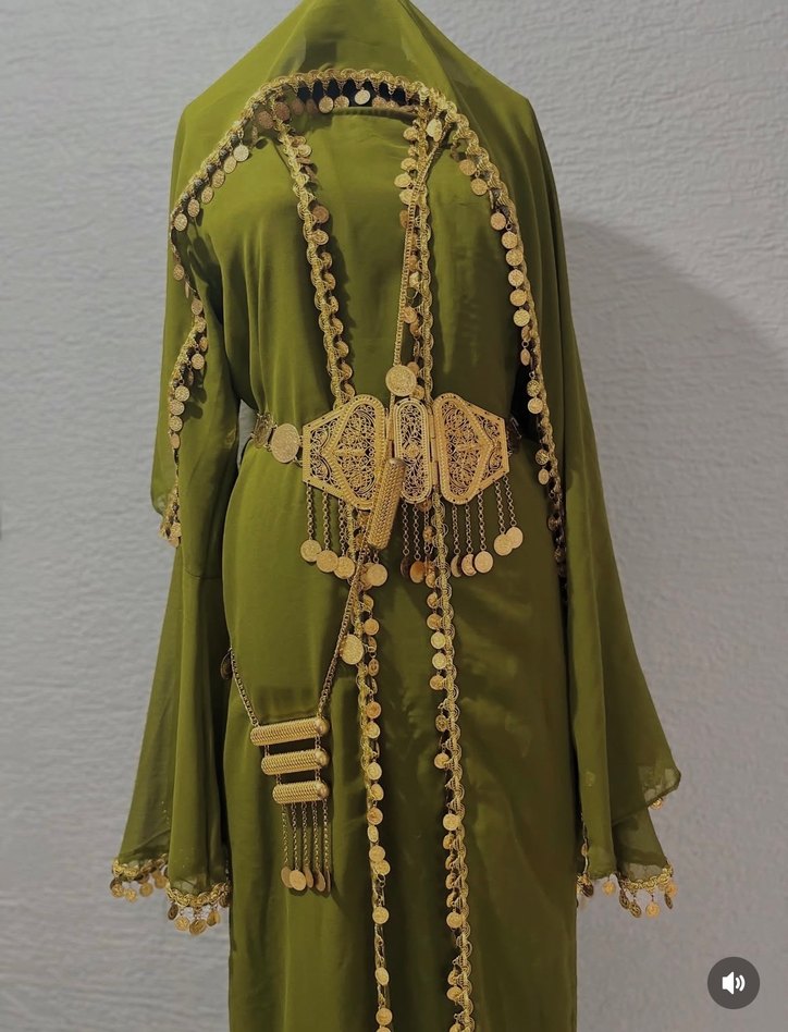 Boncuklu ve nakışlı detaylara sahip, straplez yakalı, bol kesim uzun khaki hint elbisesi. Parlak boncuk süslemeleri ve geleneksel kemeriyle düğünler için uygun.