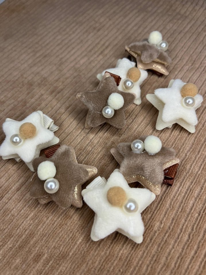 Bej ve gri tonlarda, boncuklu ve nakışlı yıldız şeklinde çocuk saç tokaları, bohem tarzı sunar.