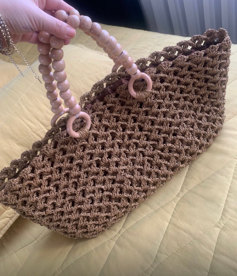Bej renkli, boncuklu saplı, örgü kumaştan yapılmış bohem tarzda kadın çantası. Yumuşak dokulu ve gündelik kullanıma uygun.
