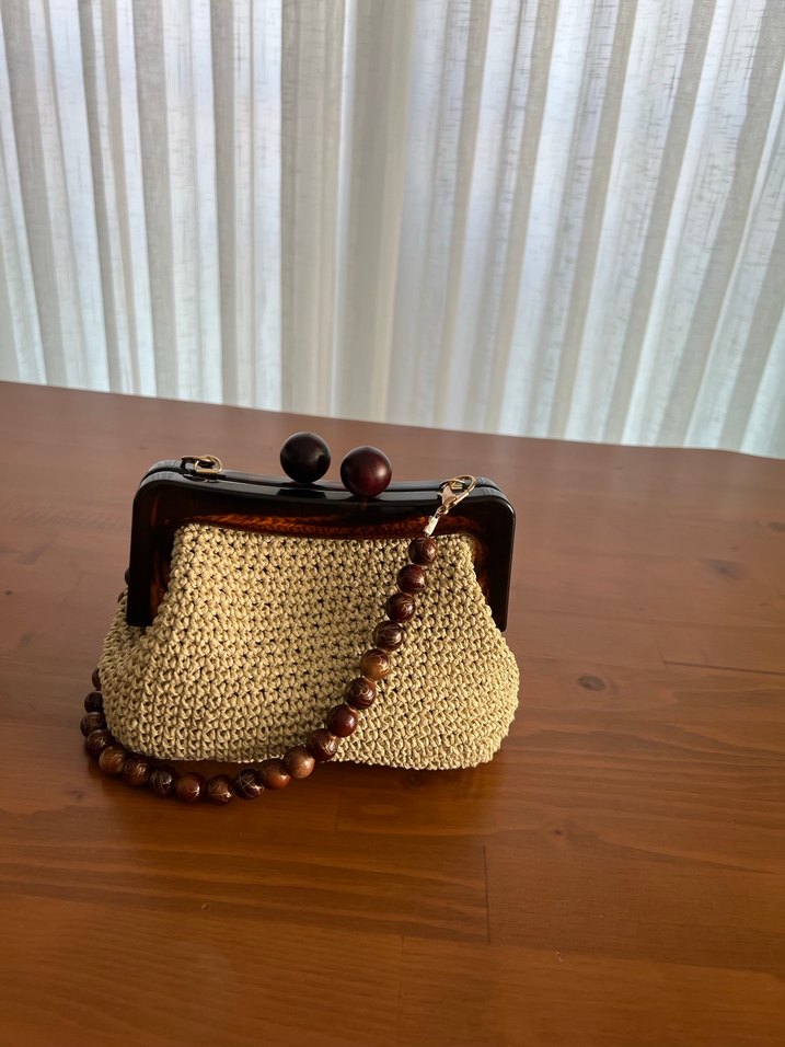 Açık kahverengi örgü kadın portföy çanta, boncuklu saplı ve vintage bohem tarzda, günlük kullanım için uygundur.