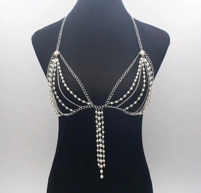 Boncuklu detaylara sahip parlak beyaz vücut zinciri, çoklu sarkıt zincirlerle cesur ve göz alıcı bir tarz sunar. Parti için uygundur.✨