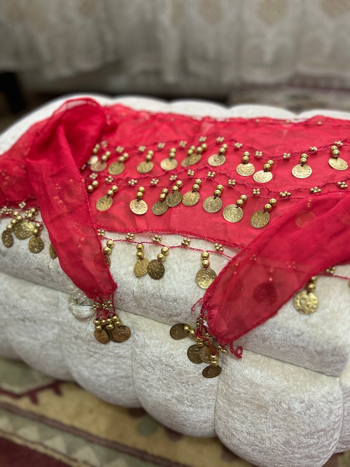Parlak boncuk ve madeni paralarla süslenmiş kırmızı tekstil şal, bohem tarzıyla hippie ve retro görünüme uygun, hafif ve dekoratif shakira kemeri