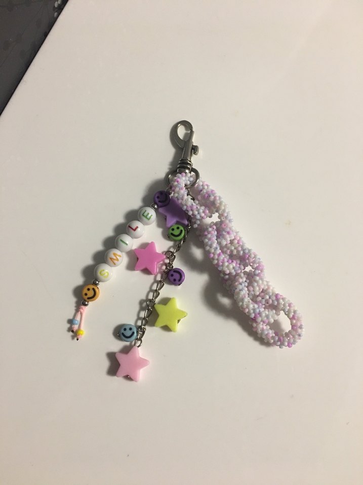 Bu boncuklu anahtarlık, pastel renkler, gülen yüzler, yıldızlar ve örgülü tasarım ile bohem ve retro tarzını yansıtıyor. Anahtarlık. Charm. Çanta süsü. Yıldız boncuklar metal aparatlar ve kum boncuklar kullanılarak yapılmıştır. Kendi el emeğimdir. Hiç kullanılmamıştır. Yenidir. Sevdiklerinize, çocuklarınıza ve arkadaşlarınıza alabileceğiniz el emeği hediye. #etiket #charm #çantasüsü #anahtarlık #hediye #hediyelik #elemeği #elişi #kumboncuk #yıldız #smile #gülenyüz #boncukçantasüsü #boncukanahtarlık #elemeğianahtarlık