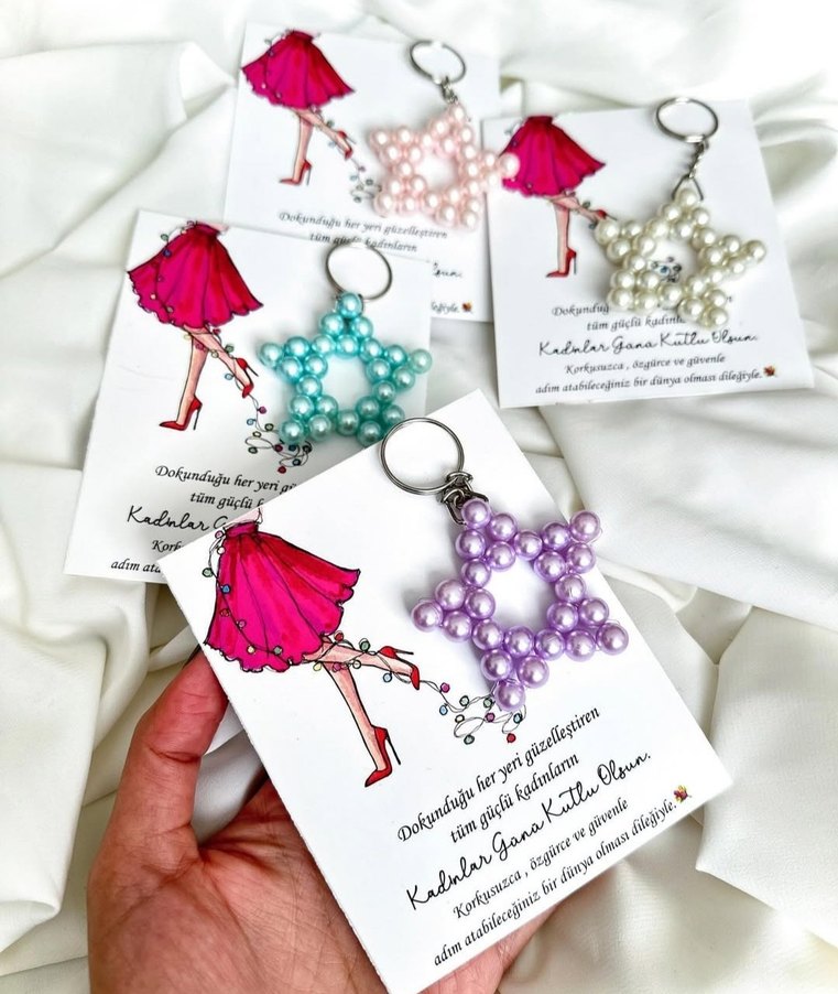 Boncuklu, pastel renklerde yıldız şeklinde anahtarlık. Bohem tarzıyla dikkat çeken bu anahtarlıklar, "Kadalar" yazılı kartla birlikte gelir.