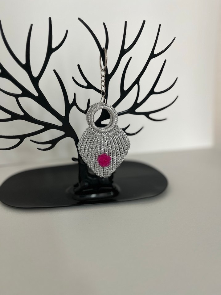 Boncuklu detaylara ve pembe aksana sahip renkli bohem anahtarlık, retro ve ışıltılı tarz için uygun.