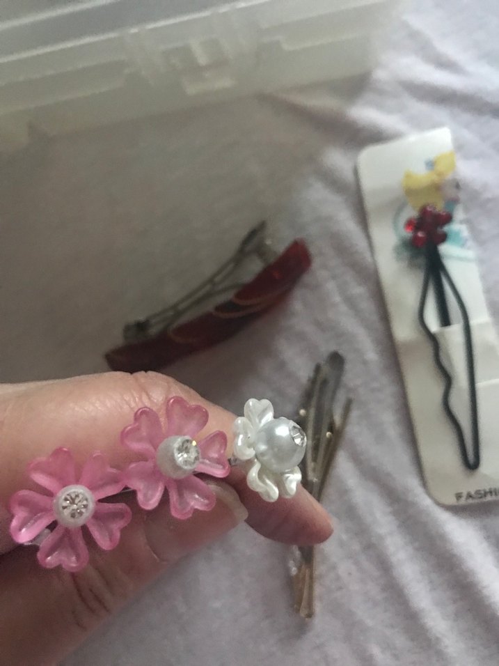 Pembe renkli, boncuklu çiçek tasarımlı saç tokası, şeffaf ve inci görünümlü boncuklarla süslenmiştir. Hepsi