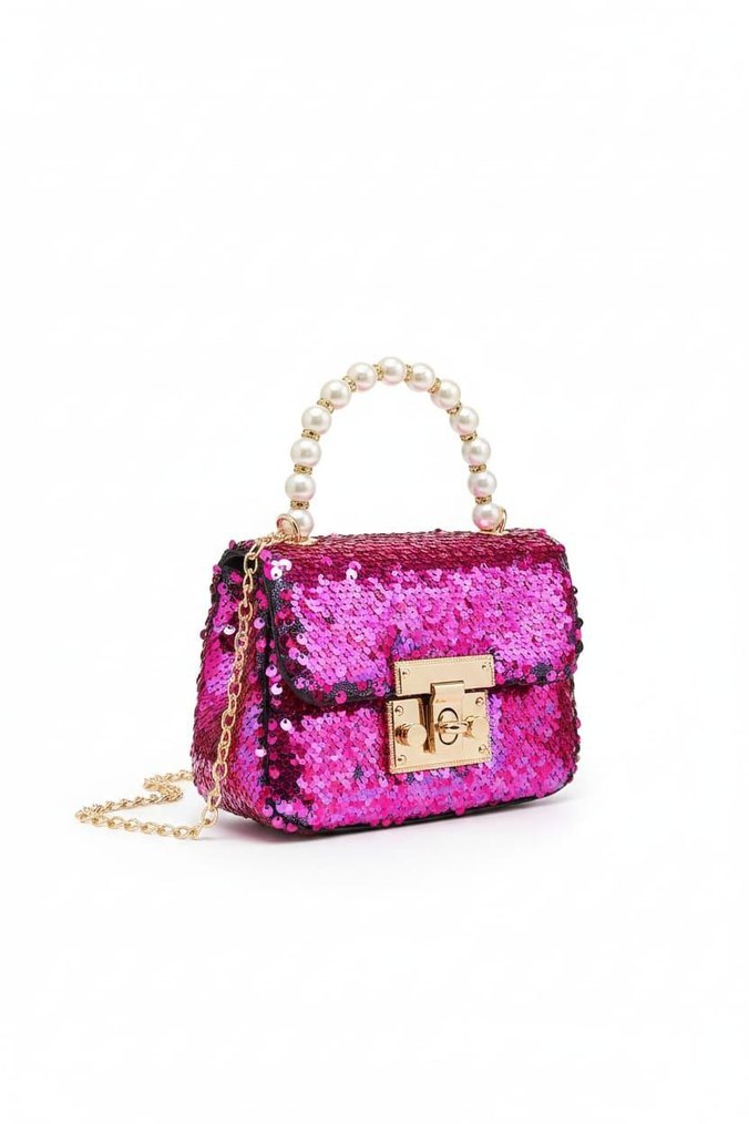 Pembe payetli dış yüzey, boncuklu inci sap ve altın renkli kilit bulunan kadın çantası. Altın zincir askılı, plastik malzemeden, yılan desenli, romantik akşamlar için uygun.