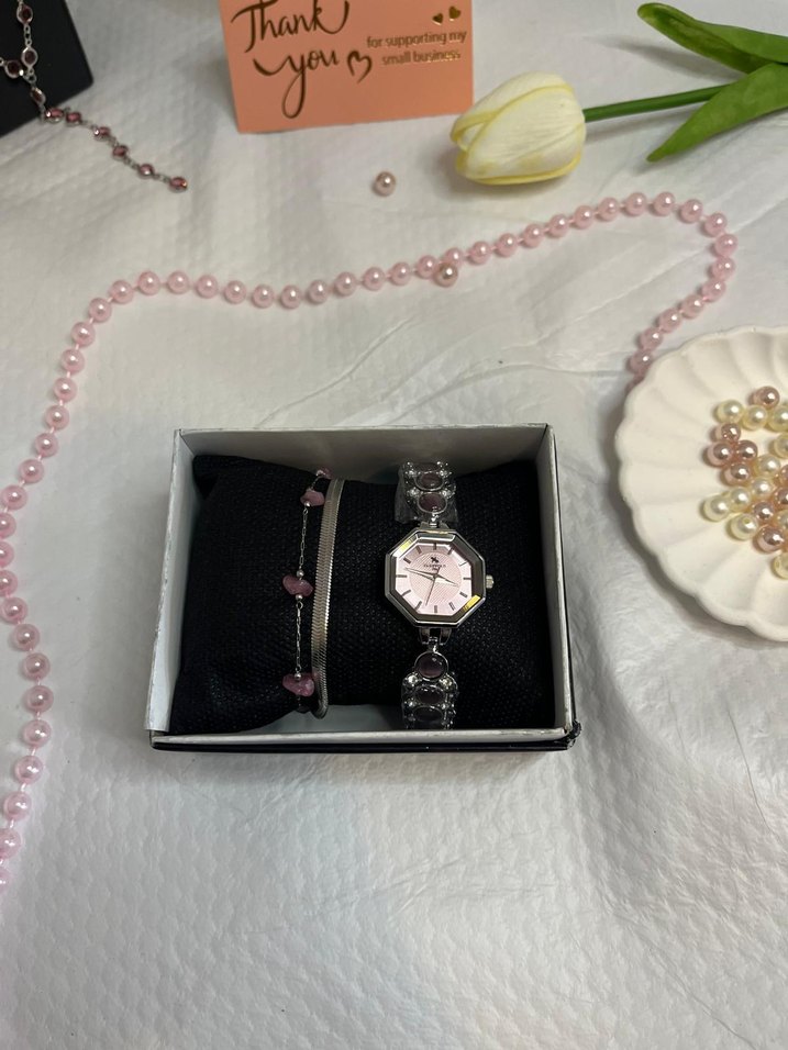 Boncuklu tasarıma sahip koyu pembe kadın kol saati, çağdaş ve klasik zarafeti yansıtıyor. Set içinde uyumlu boncuklu bileklik bulunur. Saat kadranında "Thank" yazısı mevcut. ⌚