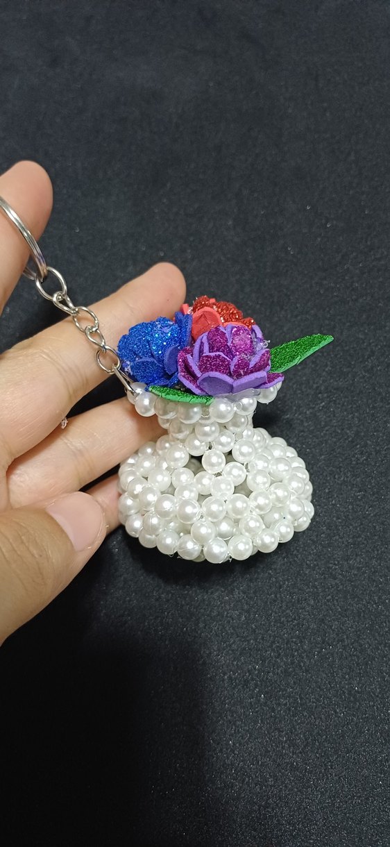 Renkli bohem tarzda, boncuklarla süslenmiş taban ve simli çiçek detayları bulunan anahtarlık.