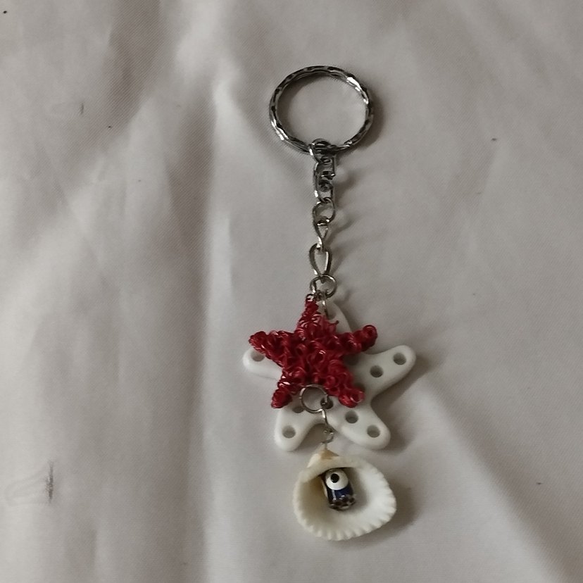 Boncuklu, kırmızı denizyıldızı, beyaz yıldız ve göz boncuklu küçük kabuk içeren renkli bohem tarzda anahtarlık.