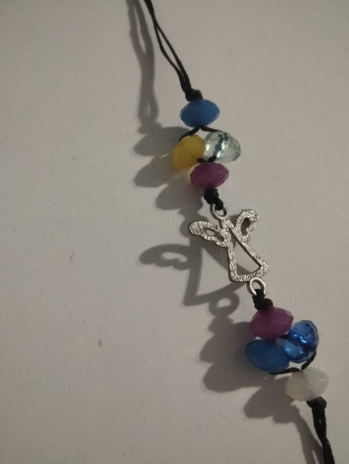 Renkli boncuklar ile süslenmiş, gümüş renkli melek figürlü bohem tarzda kadın bileklik. Günlük kullanıma uygun.