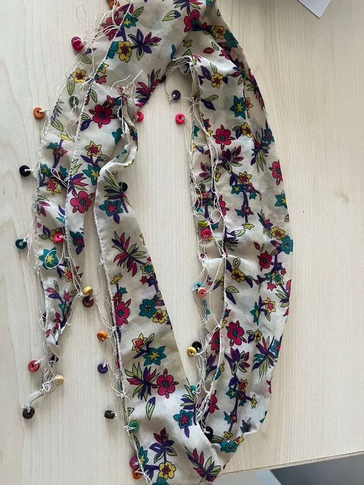 Boncuk detaylı, çiçek desenli, renkli kadın fular, bohem tarzda ve tekstil malzemeden üretilmiştir.