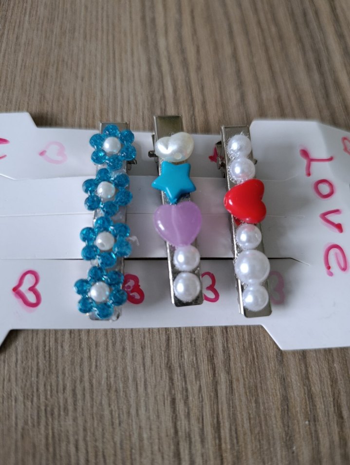 Çiçek, yıldız, kalp ve inci şeklinde plastik boncuklarla süslenmiş renkli kadın saç tokaları seti, bohem tarzda.
