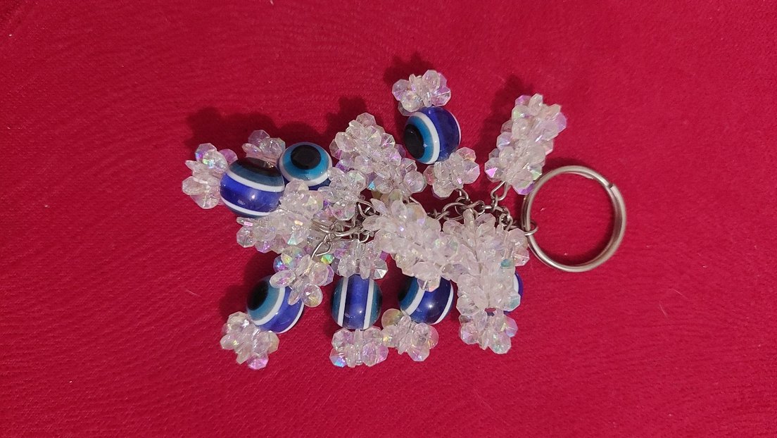 Bohem tarzda, renkli mavi boncuklar ve parlak şeffaf boncuklardan oluşan, göz motifli, ışıltılı ve retro görünümlü anahtarlık.