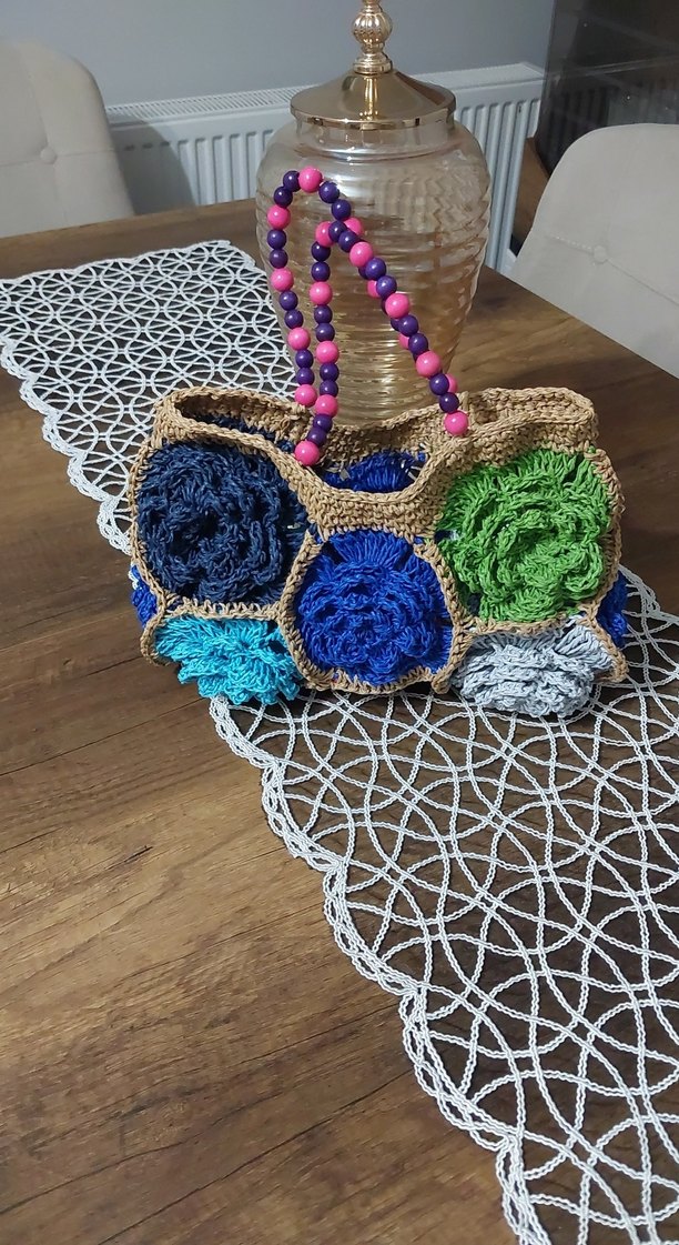 Örgüden yapılmış, renkli çiçek desenli ve boncuklu saplı bohem kadın çantası, günlük kullanıma uygundur.