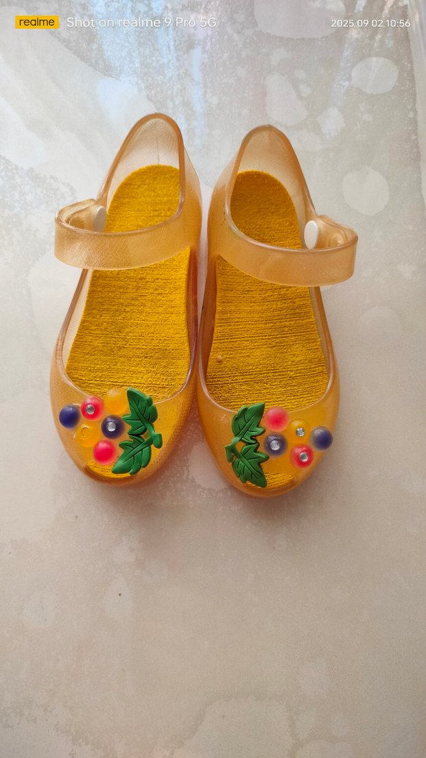 Sarı renkte, boncuklu çiçek desenli kız terliği. Kauçuk malzemeden yapılmış, bohem tarzı yansıtan ve kaymaz tabanlıdır.
