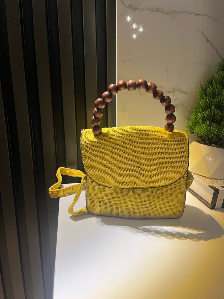Sarı örgü kumaştan yapılmış, boncuklu saplı ve yılan desenli kadın çantası, bohem ve minimalist tarzları bir araya getirir.