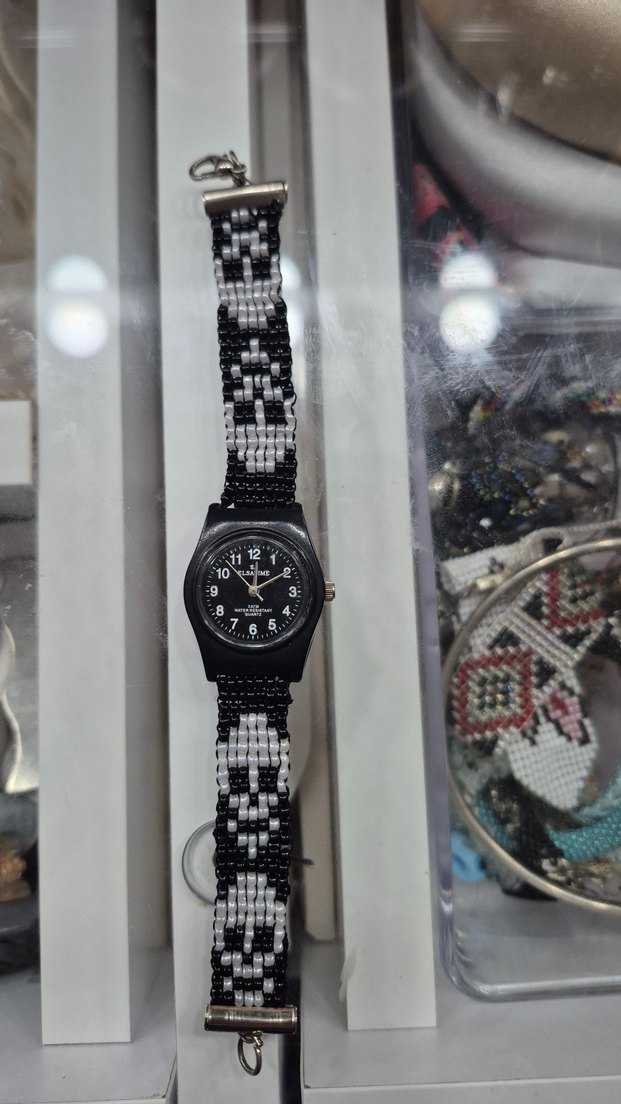 Minimalist tasarıma sahip, siyah ve gri boncuklu kayışlı kadın saati. Siyah kadranı ve sade görünümüyle dikkat çekiyor. ⌚sağlamdır çalışıyor