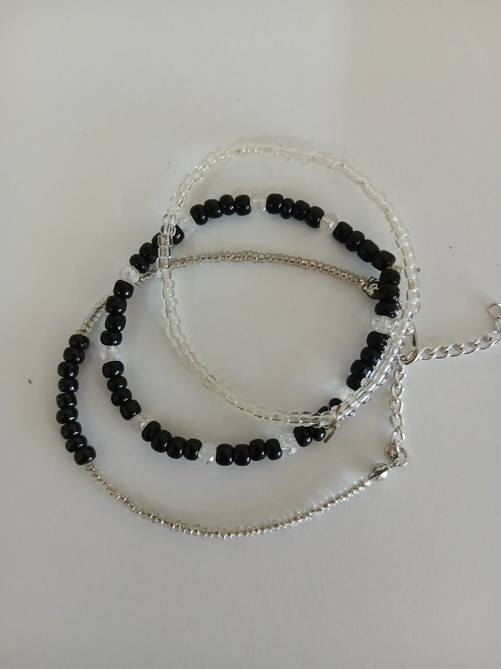 Minimalist bohem tarzda siyah ve şeffaf boncuklu, sade tasarımlı kadın el zinciri, günlük kullanım için uygundur. ✨