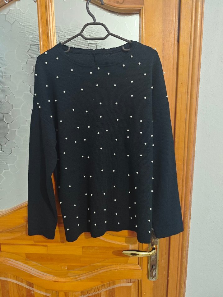 Boncuk detaylı, uzun kollu, yuvarlak yaka, siyah triko kazak. Rahat bol kesim, günlük kullanıma uygun. Omuzdan boyu 64cm, belden 48 cm.