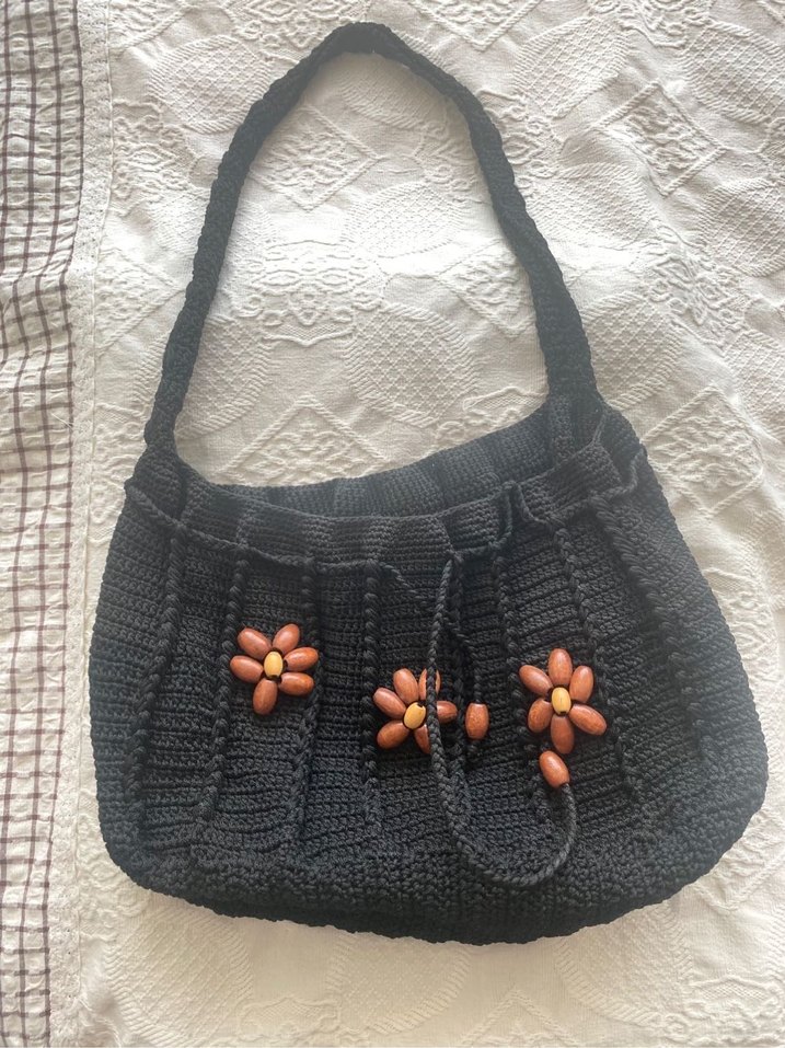 Siyah örgü malzemeden yapılmış, boncuklu çiçek desenleriyle bohem ve minimalist tarzı birleştiren kadın çantası. Günlük kullanım için uygundur. El örmesidir. Hiçbir deformasyonu yok çok az kullanıldı. En yaklaşık 36cm. Boy yaklaşık 25 cm. Askı boyu yaklaşık 77cm.