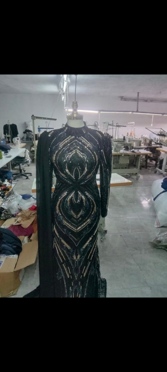 Boncuk işlemeli, uzun kollu, yüksek yakalı siyah abiye elbise. Çağdaş, düzenli kesimiyle avangard tarzı yansıtır. Düğünler için uygun. ✨