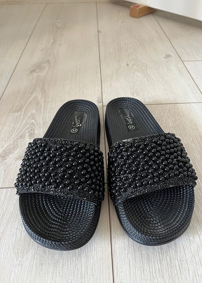 Bayan boncuklu terlik. Az biraz deformesi var. Fotoğraflarda görünüyor. Onun dışında temiz.