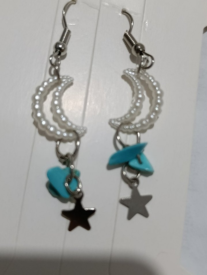 Boncuklu hilal ay, turkuaz taşlar ve yıldız figürlü bohem tarz küpeler. Romantik akşamlar için uygun.