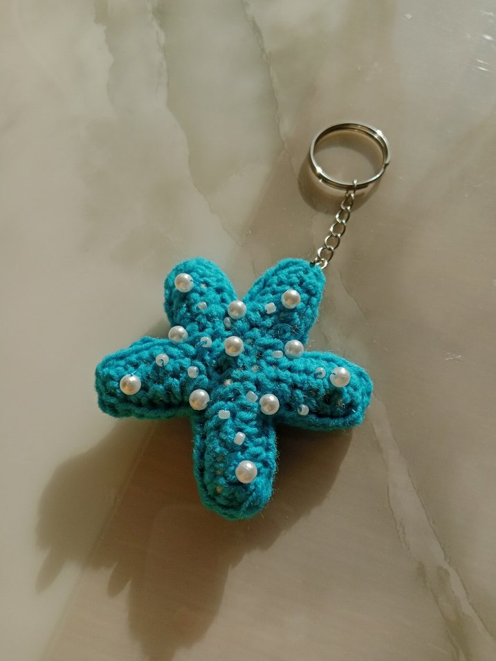 Turkuaz renkli, boncuklu örgü çiçek şeklinde bohem tarzda anahtarlık, sıcak ve renkli bir aksesuar sunar.