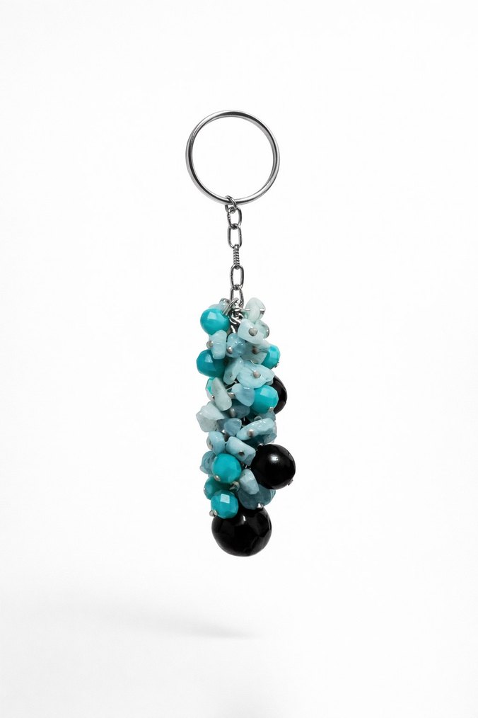 Bohem tarzda, turkuaz ve siyah boncuklardan oluşan renkli ve minimalist anahtarlık.