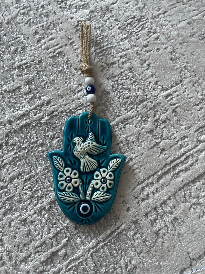 Boncuklu ve nakış desenli turkuaz bohem el figürü, günlük kullanım için uygundur. Kuş ve çiçek tasarımına sahiptir, nazar boncuğu içerir. ️ hiç kullanılmadı yenidir